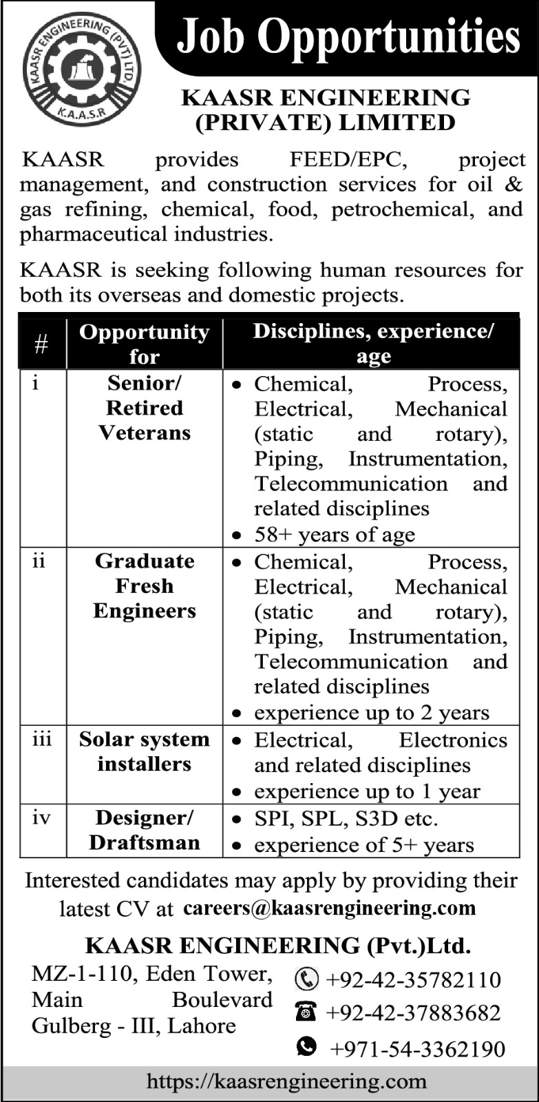 | Graduate Fresh Engineers | Disciplines, experience/age: Chemical, Process, Electrical, Mechanical (static and rotary), Piping, Instrumentation, Telecommunication and related disciplines with experience up to 2 years. | View Job |